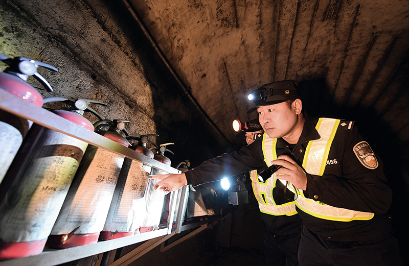 李彬在米花岭隧道内巡逻时检查消防设施(2月20日摄) 陆波岸摄/ 本刊