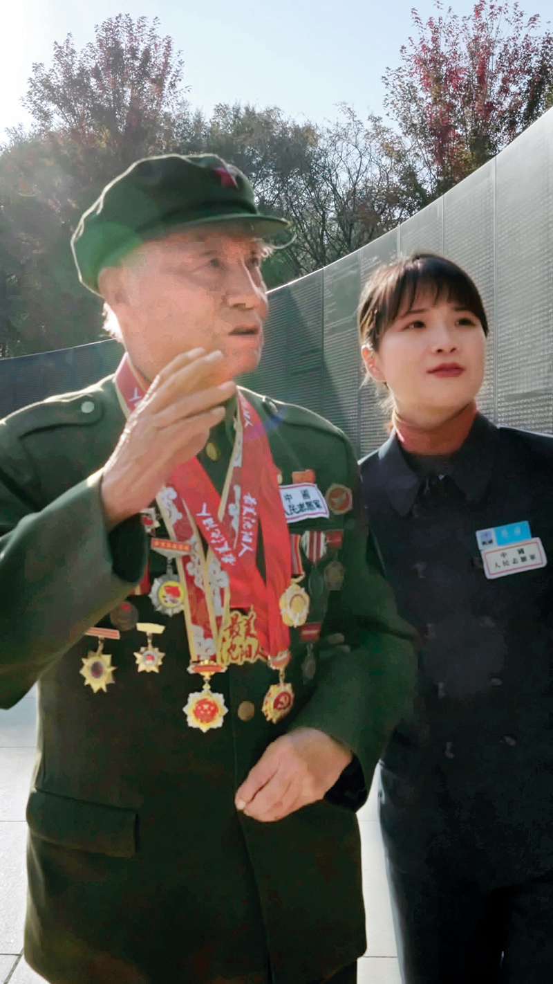 陈洁与志愿军老战士李维波在英名墙前怀念英烈 崔旭冬摄