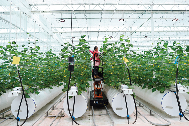 种植车间内乘轨道升降车对蔬菜进行日常管理 韩传号摄/本刊