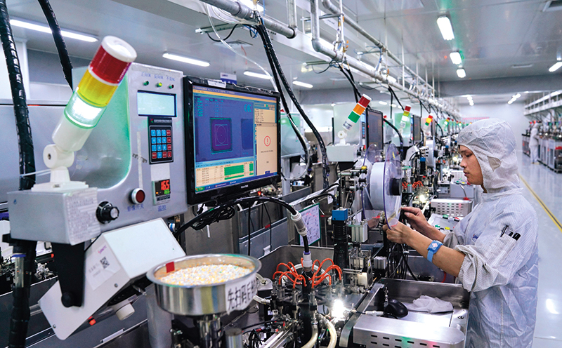 2021年6月25日,江西兆驰光元科技股份有限公司的工作人员在车间进行LED封装编带工序 胡晨欢摄/本刊