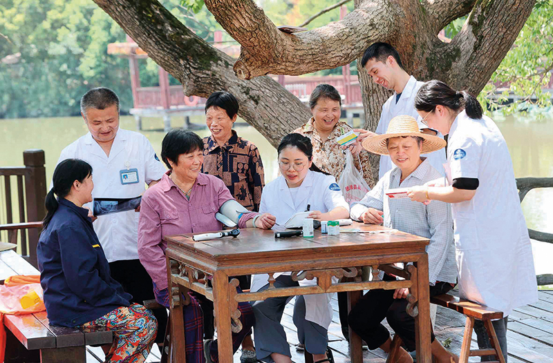 在浙江省湖州市德清县禹越镇三林村,镇卫生院医师为村民义诊(2022 年 8 月 19 日摄) 谢尚国摄 / 本刊