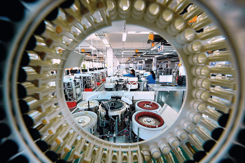 图为河北省迁安市一家生物科技企业的员工在生产线上工作(2021 年 12 月 26 日摄) 牟宇摄 / 本刊
