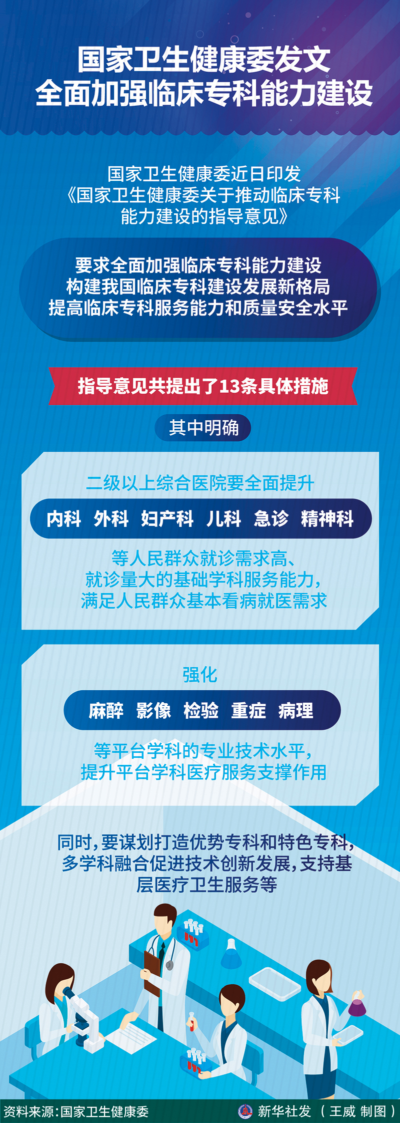 为补齐提升相关短板、进一步增强临床专科的含金量,《指导意见》按照坚持需求导向、强化规划引领、坚持守正创新、强化考核评估的原则,以优化专科组织形式、完善管理运行机制、加强人才队伍培养、推动技术创新发展、提高医疗质量安全为重点,提出13条具体措施。