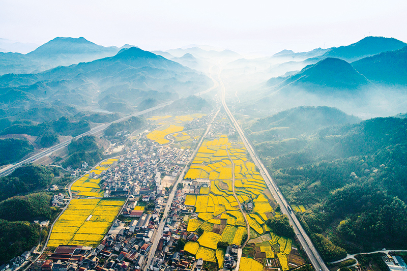 油菜花田与村庄、公路、群山构成一幅美丽画卷(2025 年 4 月 2 日摄)胡剑欢摄 / 本刊
