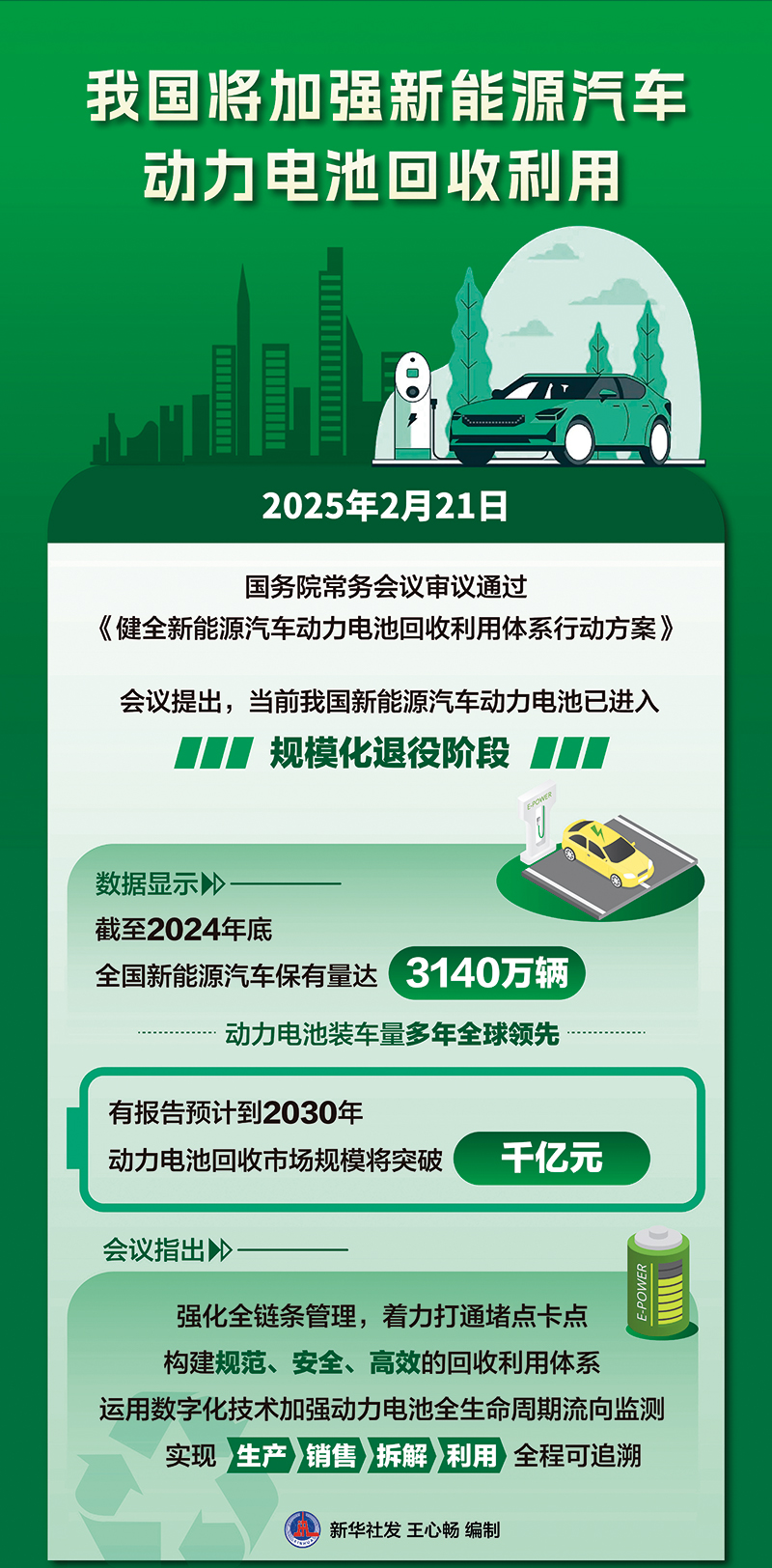2025年2月21日,国务院常务会议审议通过《健全新能源汽车动力电池回收利用体系行动方案》,强化顶层设计和标准引领。