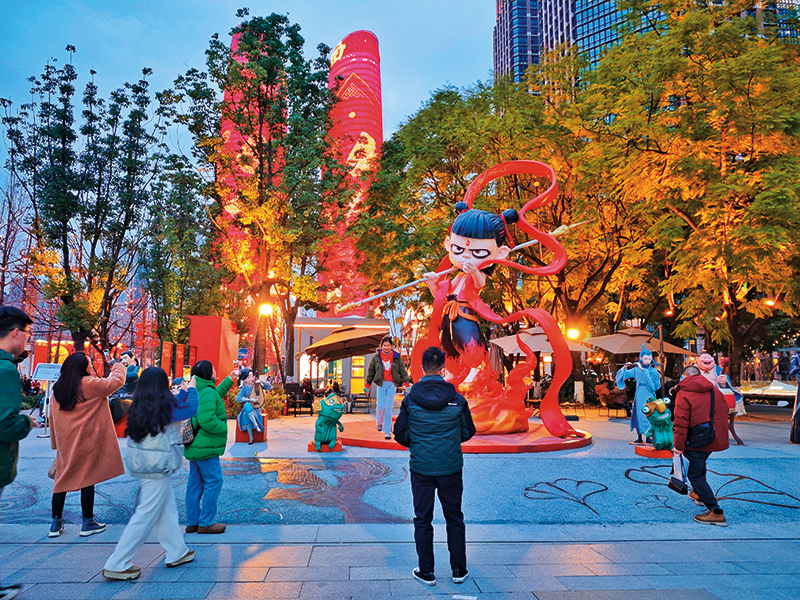 成都交子大道与益州大道交会处的哪吒主题雕塑群吸引市民打卡(2025 年 2 月 2 日摄) 胡大田摄