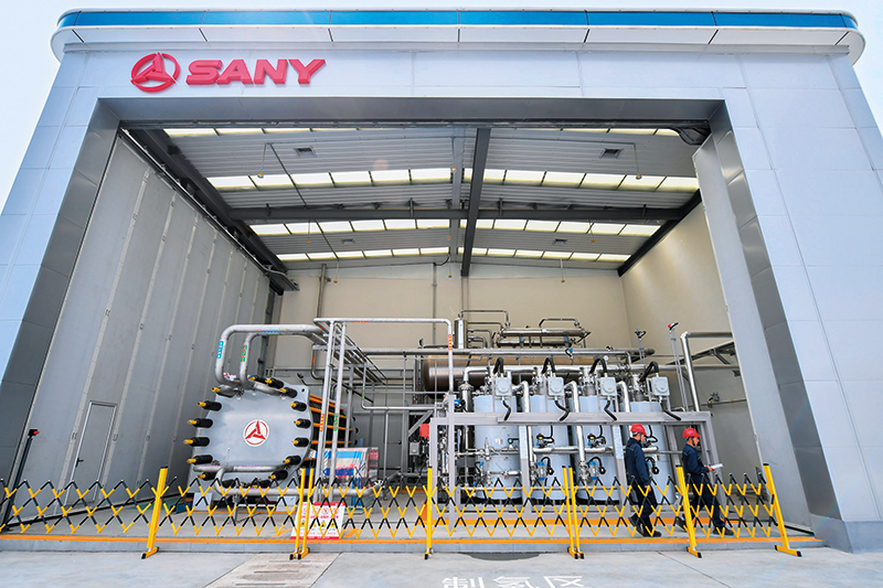 在长沙经开区的三一绿电制氢加氢一体站,工作人员在制氢区巡检(2024 年 3 月 20 日摄)陈泽国摄 / 本刊