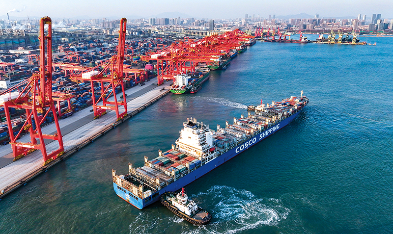 在山东港口日照港集装箱码头,满载集装箱的船舶驶离港口(2025 年 12 月 5 日摄) 新华社发(李大伟摄)