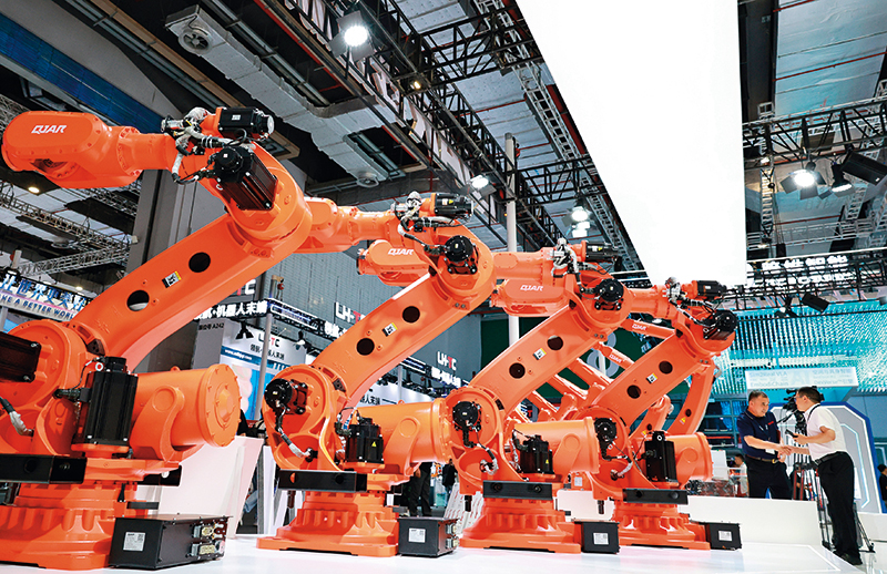 在上海举行的第 25 届中国国际工业博览会上展出的一组大型工业机器人产品(2025 年 9 月 23 日摄) 方喆摄 / 本刊