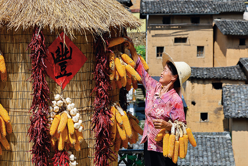 安徽省黄山市歙县阳产村村民正在土楼前晾晒丰收农作物(2025 年 9 月23 日摄) 新华社发(施亚磊摄)