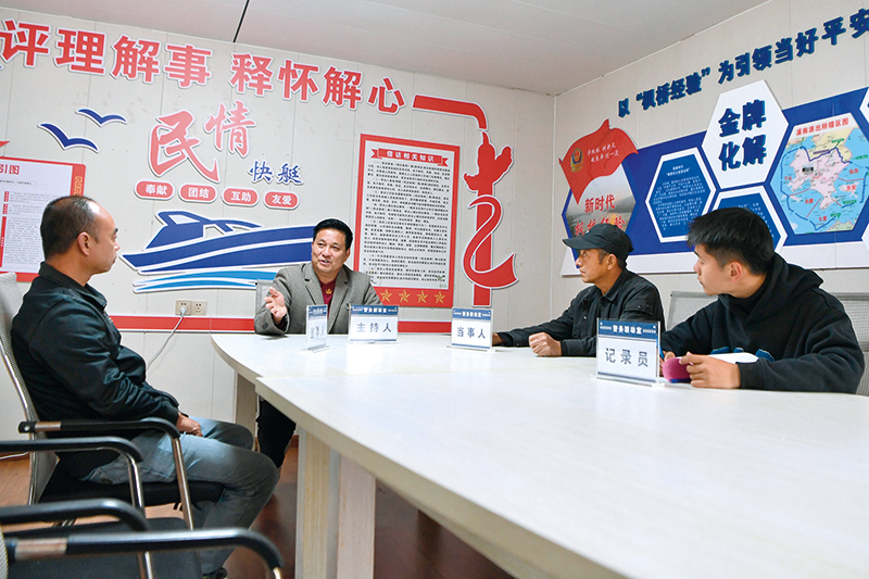 在调解一起海上养殖雇主与员工的工资纠纷(资料照片) 姜克红摄 / 本刊
