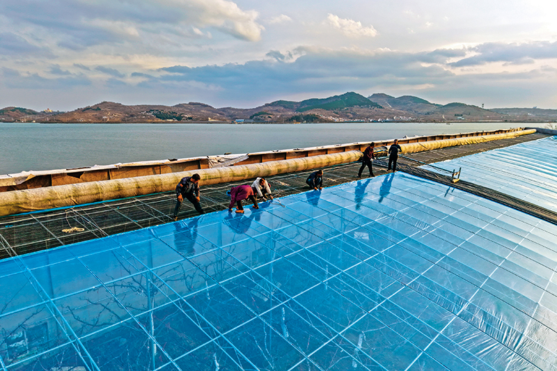 在山东省烟台市福山区张格庄镇,农民为樱桃大棚更换新的塑料薄膜(2025 年 12 月 11 日摄)新华社发(孙文潭摄)