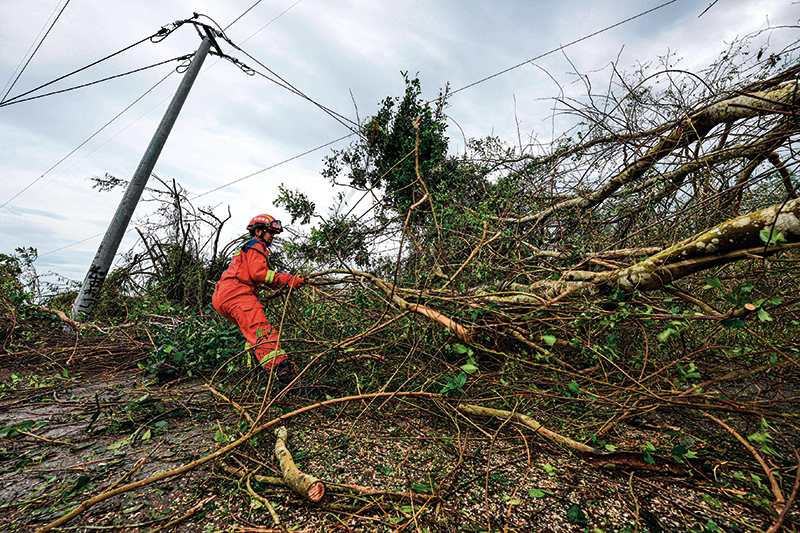 在海南省澄迈县,澄迈县消防救援大队救援人员在清理被台风刮倒的大树(2024 年 9 月 7 日摄)蒲晓旭摄 / 本刊