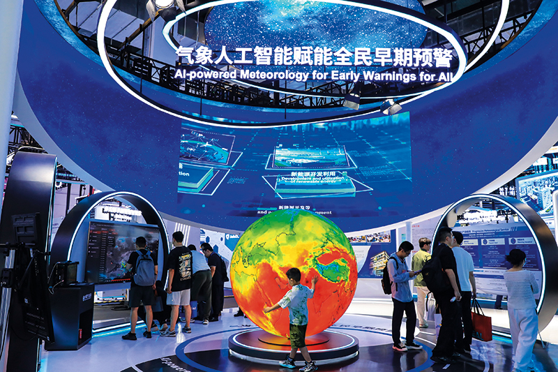 在上海举办的 2025 世界人工智能大会上展出的天气预报大模型(2025 年7 月 27 日摄) 图片来源:视觉中国