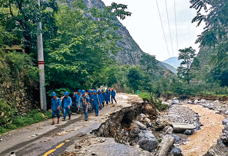国网陇南供电公司电力抢修队在甘肃省陇南市武都区三河镇花椒沟进行抢修(2024 年 8 月摄)国网陇南供电公司电力抢修队供图