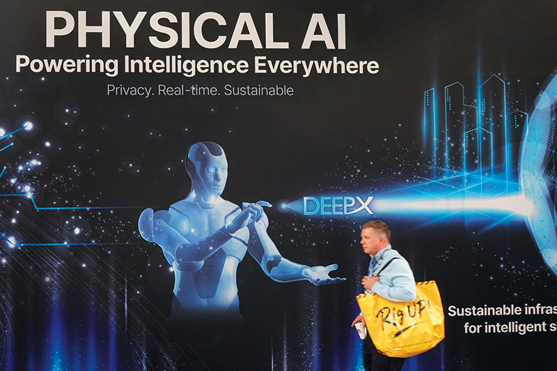 一名男子在 2026 年美国拉斯维加斯消费电子展上走过印有“物理 AI”字样的展台(2026 年 1 月 7 日摄)新华社发(曾慧摄)
