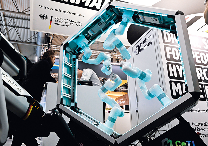 在西班牙巴塞罗那举办的 2026 年世界移动通信大会上,德国航空航天中心展示一款多臂协作机器人系统(2026 年 3 月 3 日摄) 程敏摄 / 本刊