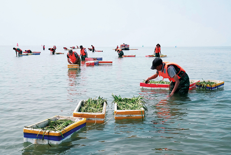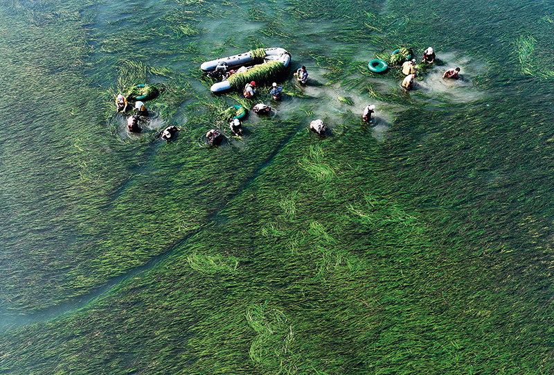 中船环境集团的工人在唐山市曹妃甸区海洋生态保护与修复项目鳗草苗采集海域采集鳗草苗(资料照片)杨世尧摄 / 本刊