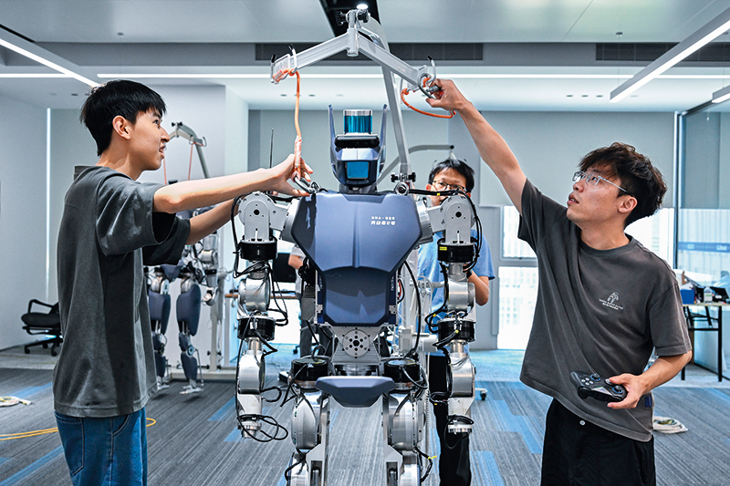 团队成员准备对“劳动者”系列人形机器人进行调试(2025 年 6 月 30 日摄) 杜子璇摄 / 本刊