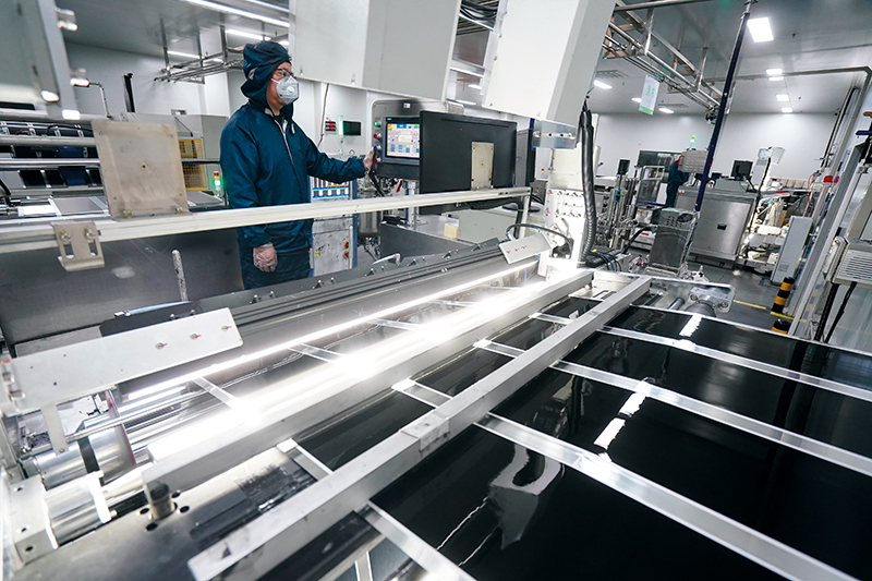 工人在位于江苏省泰州市的双登集团股份有限公司锂电池生产车间作业(2025 年 4 月 5 日摄) 季春鹏摄 / 本刊