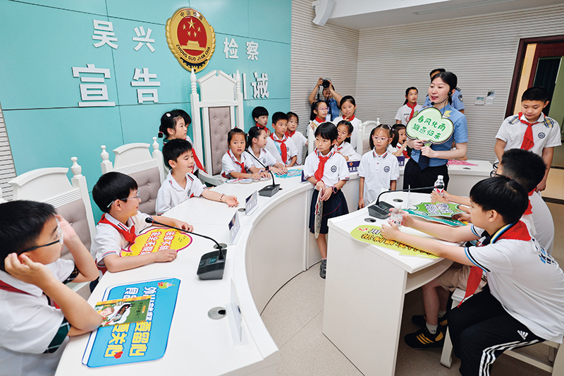 浙江省湖州市吴兴区人民检察院检察官带领小学生参观未成年人检察办案区(2024 年 7 月 3 日摄) 黄宗治摄 / 本刊