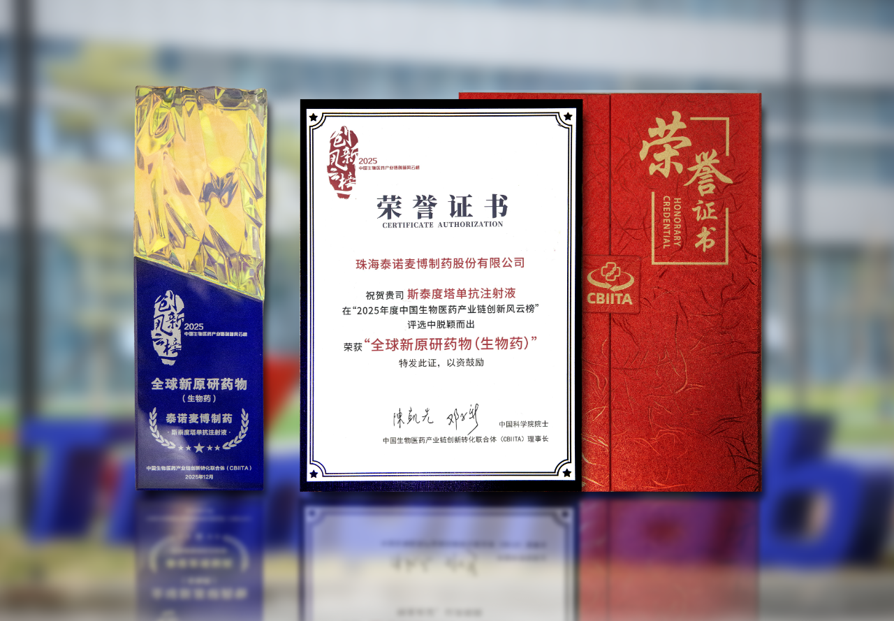 2025年12月12日,在上海虹桥举办的第七届中国生物医药产业链创新转化论坛上传来喜讯:珠海泰诺麦博制药股份有限公司自主研发的斯泰度塔单抗注射液(商品名:新替妥),荣登“中国生物医药产业链创新风云榜”—— 全球新原研药物(生物药)榜单。