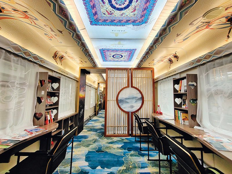 陈志慧乘坐的“崆峒号”列车,以展示平凉美景、非遗、美食为主题,设有平凉特色文旅商品、农特产品展销区、平凉文旅书刊阅览区、文化主题报刊栏等,让游客在旅途中对平凉便有所了解。
