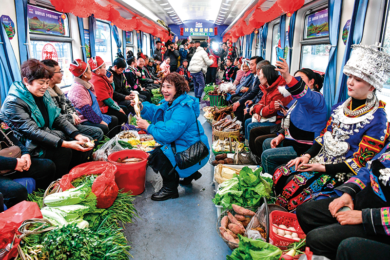 乘客在 5640 次列车上选购稻花鱼(2025 年 1 月 18 日摄) 杨文斌摄 / 本刊