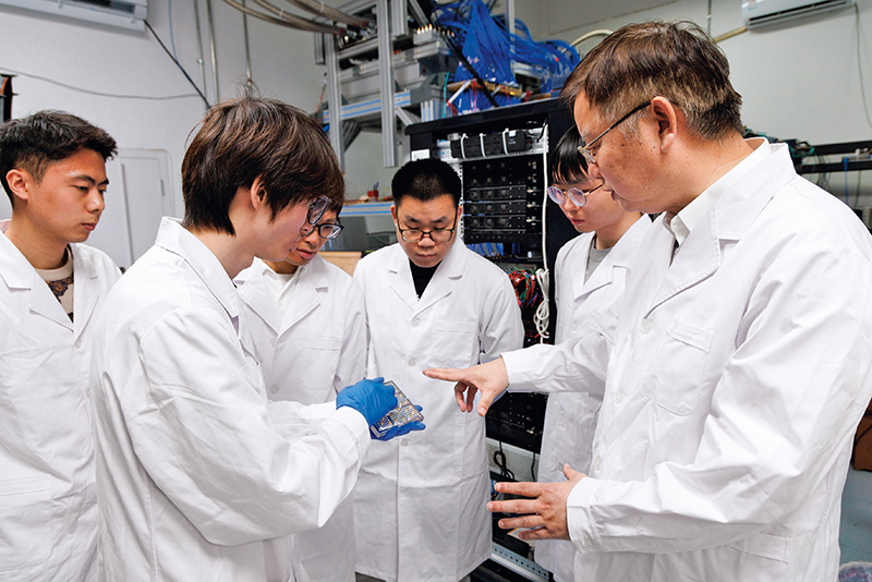 图为范桁研究员(右一)和团队成员讨论器件细节(2026 年 1 月 21 日摄) 金立旺摄 / 本刊