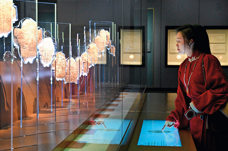 参观者在河南安阳殷墟博物馆新馆内观看展出的刻辞卜甲(2024 年 2 月 26 日摄)李安摄 / 本刊